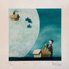 "Buon viaggio!" ritrae una scena carica di fantasia e complicità: un bambino e il suo peluche, entrambi avvolti in un’atmosfera onirica, osservano un piccolo compagno in una scatola che si libra verso una grande luna. Il cielo notturno e i toni del blu creano un contrasto magico con la luce lunare, evocando l’idea di un viaggio verso luoghi lontani, reali o immaginari.