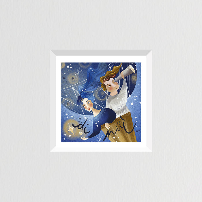 Una coppia sospesa nel cielo stellato esplora l’infinito, unita da un abbraccio che sembra fondere sogno e realtà.