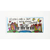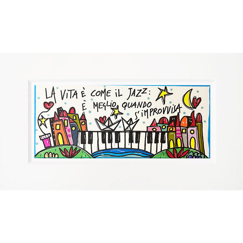 Al centro dell’opera, una tastiera di pianoforte diventa un ponte che unisce due colline piene di case variopinte, cuori e stelle, mentre barche di carta solcano un fiume blu. Sopra, la celebre frase scritta a mano dall’artista scorre come una melodia improvvisata, invitando a lasciarsi trasportare dal ritmo del momento.