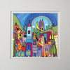 Le architetture colorate, slanciate verso la luna, formano un coro di forme e tonalità che raccontano una storia di sogno e di speranza. Ogni finestra, ogni cuore dipinto, diventa un segno di vita e di calore umano. Sullo sfondo, le colline verdi avvolgono la città come un abbraccio, custodendo il silenzio e la pace della notte.