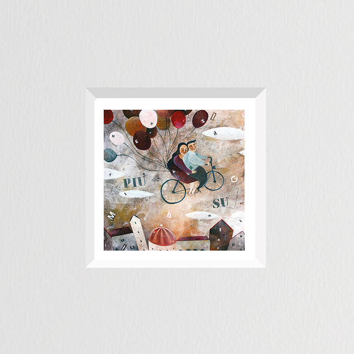 Una coppia vola sopra i tetti della città, sospinta da una bicicletta magica e da una miriade di palloncini colorati, simboli di sogni e libertà.