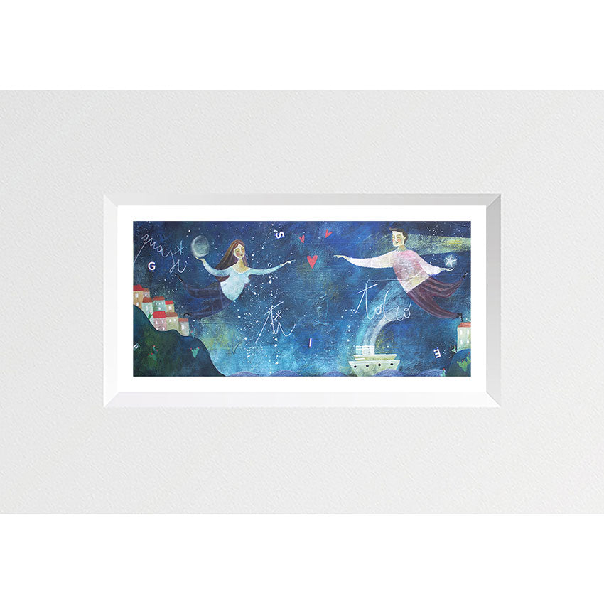 Due figure fluttuano nell’azzurro profondo della notte, tese l’una verso l’altra, separate solo da un respiro. I cuori e le lettere che danzano attorno a loro diventano segni d’amore che attraversano lo spazio.