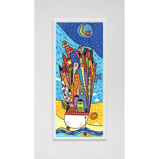In Salpiamo tutti, Wallas ci invita a un viaggio collettivo verso la fantasia e la speranza. Una grande barca bianca solca un mare sereno, portando con sé una città intera che sembra fluttuare tra cielo e sogno. Le case colorate si innalzano come vele al vento, mentre dal fumaiolo si sprigionano cuori e nuvole, simboli di gioia e leggerezza.