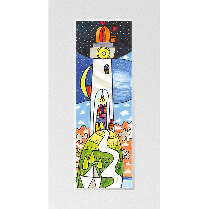 Dalla sommità, una lampadina dorata e una luna gentile illuminano la notte stellata, mentre cuori rossi e piante verdi portano vita e calore alla scena. Lungo il sentiero che conduce al faro, una barca di carta attende di salpare, simbolo di nuovi inizi e sogni da inseguire.