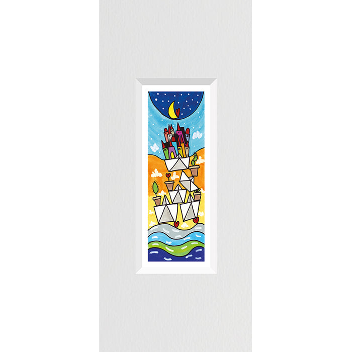 Sopra onde colorate e cieli divisi tra giorno e notte, una città poggia su vasi e forme geometriche che sembrano sfidare la gravità, ma trovano sempre il loro punto di pace.